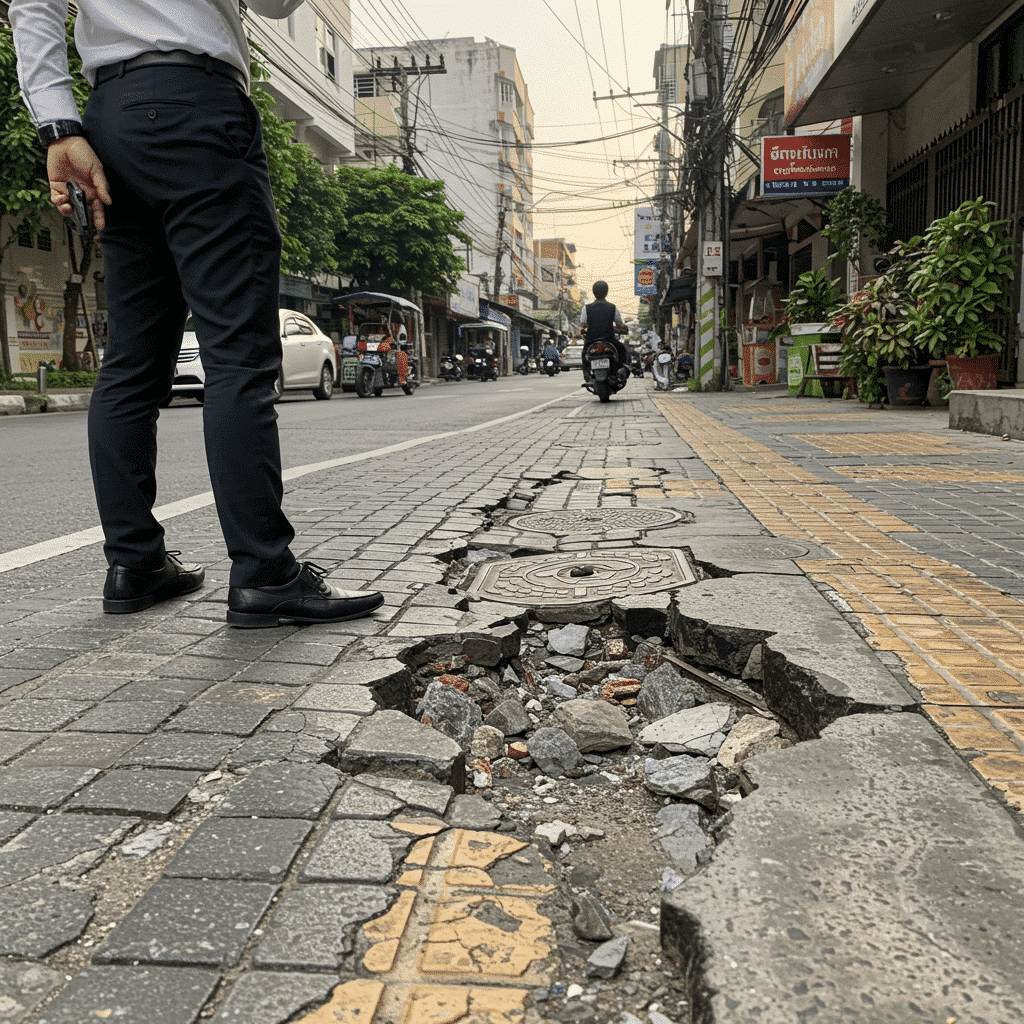 ในทางกลับกัน เมื่อทางเท้าอยู่ในสภาพที่ย่ำแย่ มันจะกลายเป็นอุปสรรคและอันตรายต่อผู้ใช้งาน อุบัติเหตุจากการสะดุดล้มบนพื้นผิวที่ต่างระดับ ตกท่อระบายน้ำที่ไม่มีฝาปิด หรือต้องเดินลงไปบนถนนเพื่อหลีกเลี่ยงสิ่งกีดขวาง เป็นเรื่องที่เกิดขึ้นจนกลายเป็นความปกติใหม่ในสังคมไทย ปัญหานี้ส่งผลกระทบอย่างรุนแรงต่อกลุ่มคนเปราะบาง เช่น ผู้ที่ใช้รถเข็นวีลแชร์ ผู้บกพร่องทางการมองเห็น และผู้สูงอายุ ซึ่งอาจถูกจำกัดการเดินทางและไม่สามารถใช้ชีวิตได้อย่างอิสระ ดังนั้น การแก้ไขปัญหาฟุตบาทจึงไม่ใช่แค่เรื่องของความสวยงาม แต่เป็นเรื่องของความปลอดภัย ความเท่าเทียม และการยกระดับคุณภาพชีวิตของทุกคนในสังคม