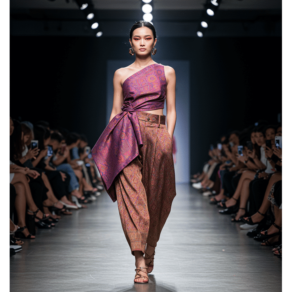 คำจำกัดความและการประยุกต์ใช้: เทรนด์นี้คือการนำองค์ประกอบจากศิลปะ หัตถกรรม และผ้าทอพื้นเมืองของไทยมาเป็นแรงบันดาลใจในการออกแบบเสื้อผ้าที่ร่วมสมัย ไม่ว่าจะเป็นการนำ ลวดลายปักมือ จากภาคเหนือ หรือ ผ้าทอที่มีลวดลายเป็นเอกลักษณ์ ของภาคอีสาน มาใช้บนโครงสร้างเสื้อผ้าแบบตะวันตก เช่น เสื้อเบลเซอร์ กางเกงทรงสปอร์ต หรือชุดเดรสค็อกเทล