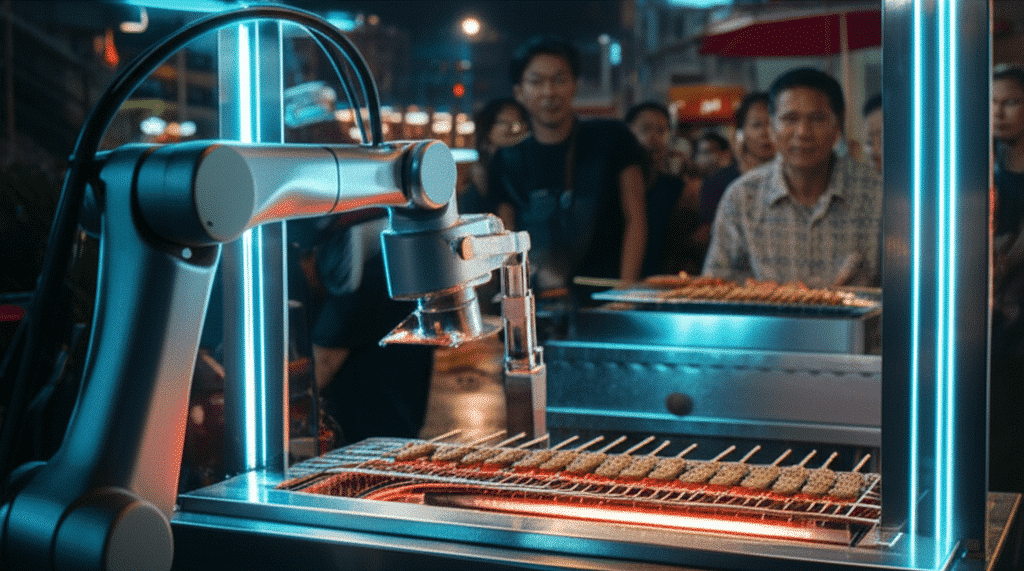 หนึ่งในตัวอย่างที่เห็นภาพได้ชัดเจนที่สุดคือการพัฒนาหุ่นยนต์แขนกลสำหรับย่างหมูปิ้ง ซึ่งเป็นเมนูยอดนิยมและพบเห็นได้ทั่วไป หุ่นยนต์ประเภทนี้จะถูกติดตั้งอยู่หน้าเตาถ่านหรือเตาไฟฟ้า โดยมีกลไกการทำงานที่ถูกตั้งโปรแกรมไว้อย่างเป็นระบบ เริ่มตั้งแต่การหยิบหมูปิ้งที่เสียบไม้เตรียมไว้จากถาดพัก ไปวางบนตะแกรงย่างอย่างเป็นระเบียบ จากนั้นระบบจะควบคุมการพลิกกลับด้านตามเวลาที่กำหนดไว้อย่างแม่นยำ เพื่อให้หมูสุกอย่างทั่วถึงและมีสีสันที่น่ารับประทาน