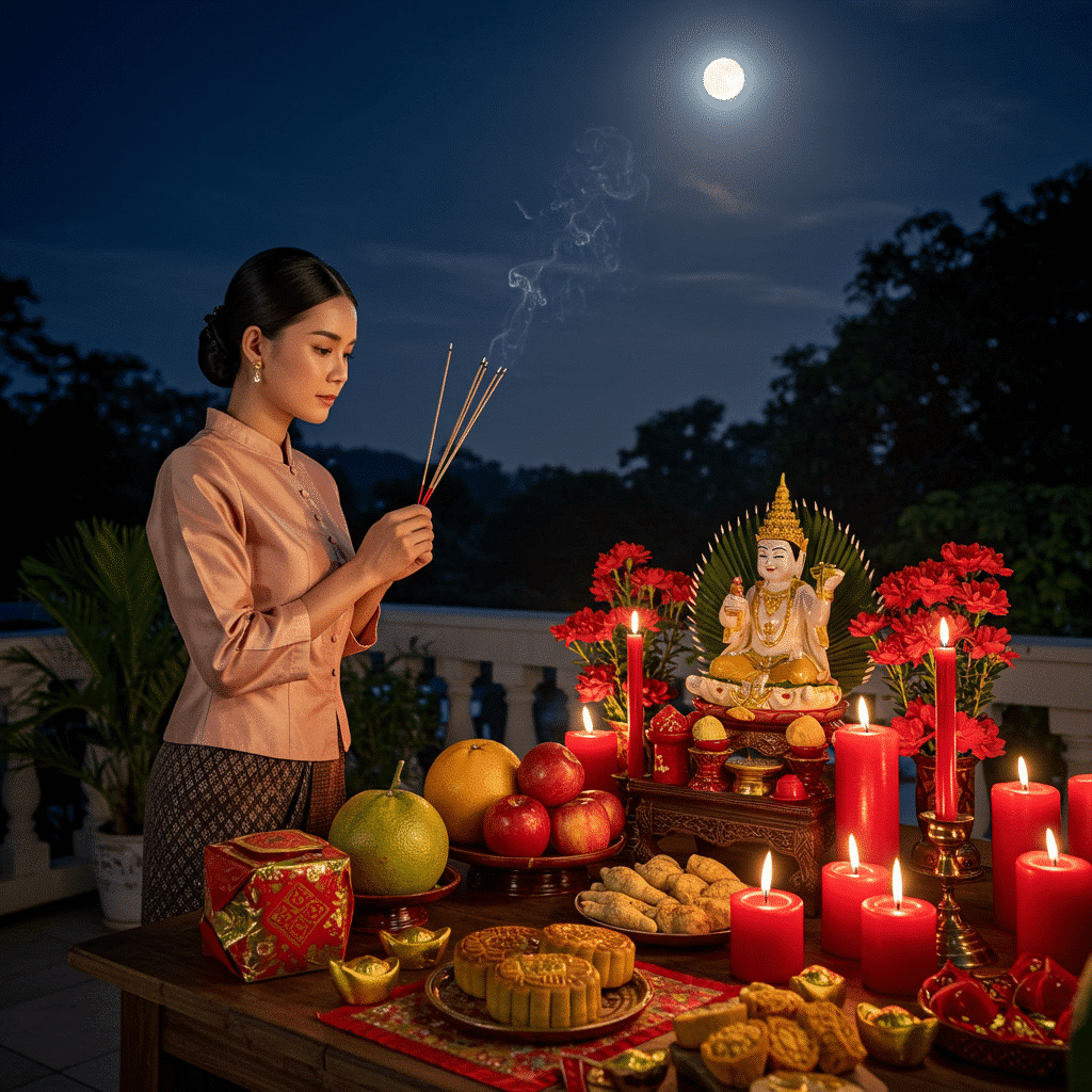- ของไหว้หลัก: สิ่งที่ขาดไม่ได้คือ ขนมไหว้พระจันทร์ ซึ่งนิยมจัดเป็นเลขคู่ (2 หรือ 4 ชิ้น) และผลไม้มงคล 5 ชนิด เพื่อความเป็นสิริมงคล