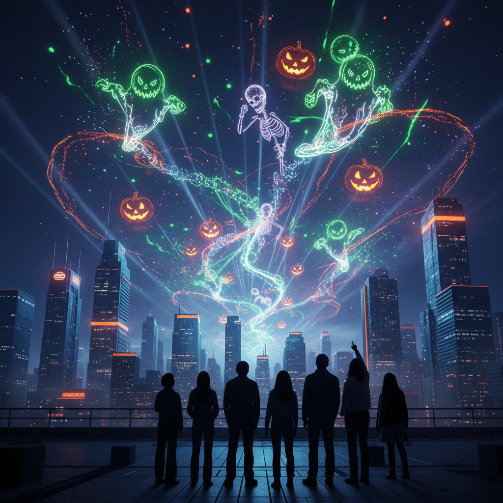 โดรนแปรอักษรผี: โชว์แสงสีฮาโลวีนแห่งอนาคต คือการนำเทคโนโลยีฝูงโดรนมาประยุกต์ใช้เพื่อสร้างสรรค์การแสดงแสงสีในธีมฮาโลวีนโดยเฉพาะ แนวคิดนี้เป็นการใช้โดรนจำนวนมากที่ติดตั้งไฟ LED บินขึ้นไปบนท้องฟ้าและจัดเรียงตัวเป็นรูปทรงต่างๆ ที่เกี่ยวข้องกับเทศกาล เช่น ภูตผี โครงกระดูก ฟักทอง หรือข้อความชวนขนลุก นับเป็นวิวัฒนาการของการจัดแสดงที่เปลี่ยนท้องฟ้ายามค่ำคืนให้กลายเป็นผืนผ้าใบดิจิทัลขนาดใหญ่ การแสดงรูปแบบใหม่นี้ไม่เพียงแต่มอบความบันเทิงที่น่าตื่นตาตื่นใจ แต่ยังเป็นทางออกที่ยั่งยืนกว่าการจุดพลุแบบดั้งเดิม ซึ่งก่อให้เกิดมลพิษทั้งทางเสียงและอากาศ ทำให้โดรนแปรอักษรกลายเป็นเทรนด์ใหม่ที่น่าจับตามองสำหรับการเฉลิมฉลองในยุคดิจิทัล