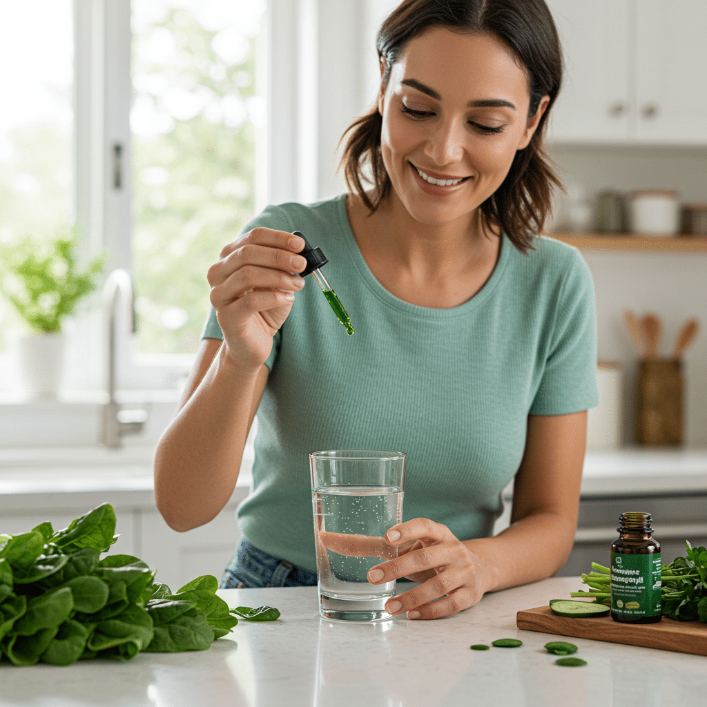 สำหรับผู้ที่ไม่สามารถรับประทานผักใบเขียวได้เพียงพอ หรือต้องการความสะดวกสบาย อาหารเสริมคลอโรฟิลล์จึงเป็นอีกทางเลือกหนึ่ง โดยส่วนใหญ่มักอยู่ในรูปของ “คลอโรฟิลลิน” (Chlorophyllin) ซึ่งเป็นสารกึ่งสังเคราะห์ที่ได้จากการนำคลอโรฟิลล์มาทำปฏิกิริยากับทองแดง ทำให้มีความคงตัวและละลายน้ำได้ดีกว่าคลอโรฟิลล์ตามธรรมชาติ ผลิตภัณฑ์เหล่านี้มีจำหน่ายในหลายรูปแบบ ทั้งชนิดน้ำสำหรับผสมดื่ม, แคปซูล, เม็ด และผง