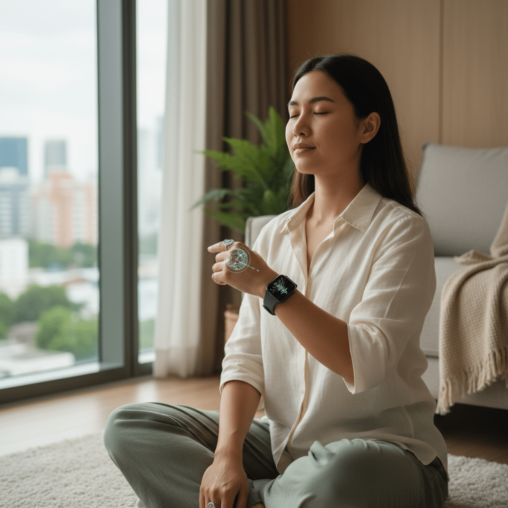 เมื่ออุปกรณ์ตรวจพบว่าผู้ใช้มีระดับความเครียดสูง หลายรุ่นจะมีการแจ้งเตือนพร้อมเสนอเครื่องมือช่วยผ่อนคลายในตัว หนึ่งในฟังก์ชันที่ได้รับความนิยมมากที่สุดคือ “การฝึกหายใจ” (Breathing Exerciser) ซึ่งเป็นโปรแกรมแนะนำการหายใจเข้า-ออกอย่างช้าๆ และเป็นจังหวะ การกำหนดลมหายใจในลักษณะนี้จะช่วยกระตุ้นการทำงานของระบบประสาทพาราซิมพาเทติกโดยตรง ซึ่งส่งผลให้อัตราการเต้นของหัวใจช้าลง ความดันโลหิตลดลง และทำให้ร่างกายและจิตใจเข้าสู่สภาวะผ่อนคลาย การใช้เวลาเพียงไม่กี่นาทีกับฟังก์ชันนี้สามารถช่วยลดความเครียดเฉียบพลันและช่วยให้ผู้ใช้ควบคุมสติอารมณ์ได้ดีขึ้นในสถานการณ์ที่กดดัน